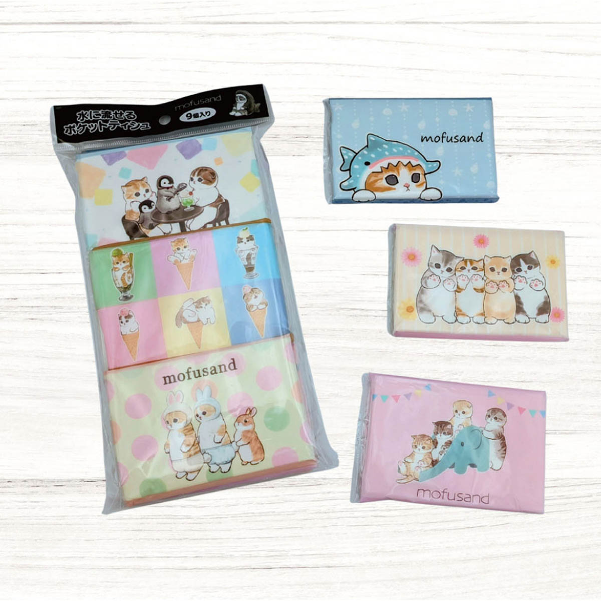 mofusandThis is a 9 pack of pocket tissues. There are 6 patterns in the package! Just holding it will make you feel relaxed. The contents are a flushable tissue.