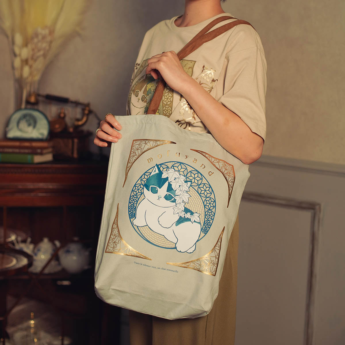 箔プリントと猫の存在感で、持つだけで特別な印象に。