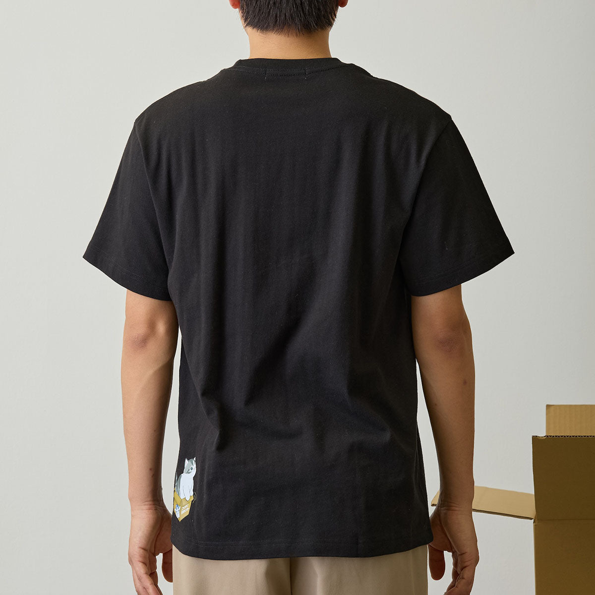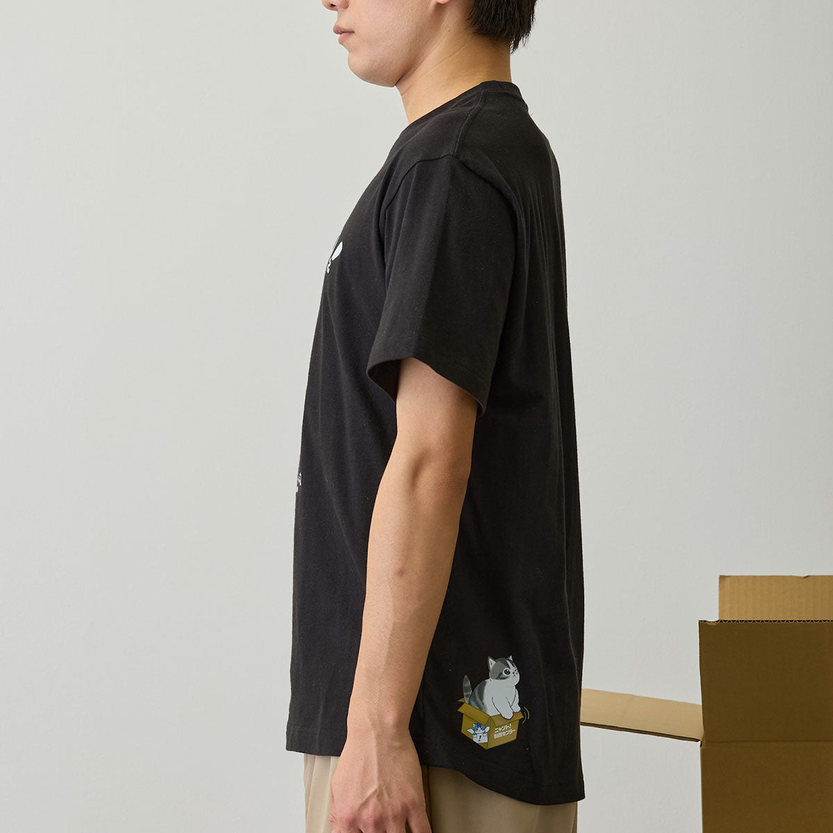 擁抱紙箱的貓咪造型,以及虛構的免付費電話,讓黑色T恤呈現出超現實的氛圍。